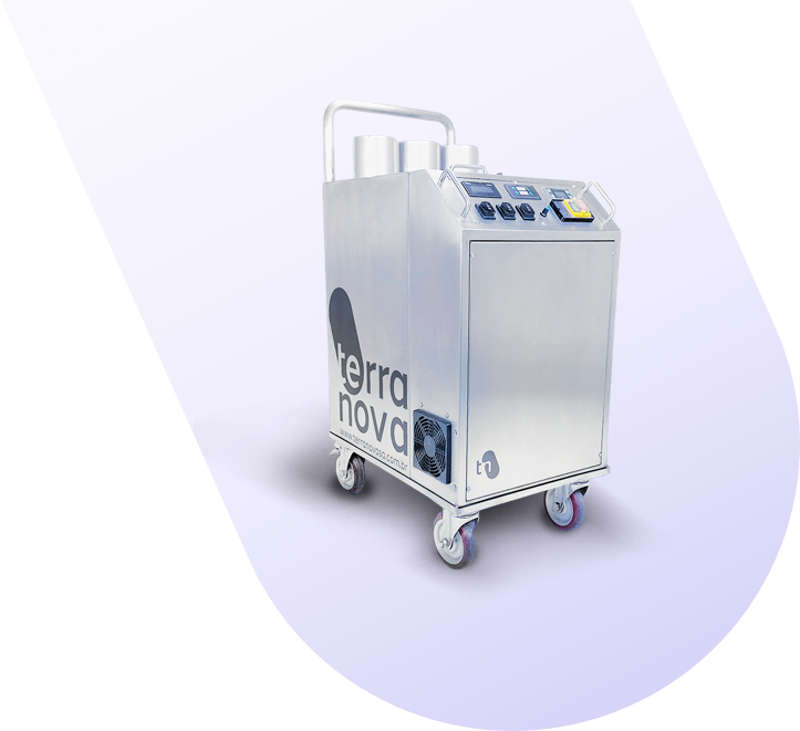 Tecnologia DryFog (névoa seca), um sistema de geração de micro gotas da solução desinfetante, produzidas a partir da agitação de suas moléculas.